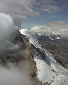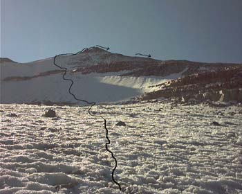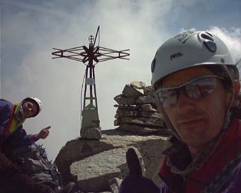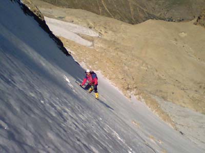 In sintesi, siamo partiti da Pont, Valsavaranche (1960m) alle 5:00, c'era un freddo cane quindi benissimo! Arrivati al rif. V.Emanuele, fatta la seconda colazione, abbiamo avvisato il gestore del nostro itinerario. Ripartiti, abbiamo raggiunto la base del versante camminando su detriti e rocce montonate guidati da ometti di pietra. Abbiamo scelto l'attacco che ci sembrava migliore, indossati imbragature, ferraglie, corda e cordini, abbiamo attaccato il ghiacciaio ed, attraversati un paio di grossi crepacci, ci siamo portati sotto il primo tratto (il più ripido, 40°-45° circa) salendo il pendio sulla destra. Poi un piccolo traverso verso sin (foto qui sopra) ed abbiamo attraversato qualche roccetta un tempo ricoperta dal ghiacciaio. Risalito il pendio finale, ci siamo spostati a sin sulla cresta nord-nord-est (molto più bello che spostarsi a dx sulla via normale) e da lì abbiamo raggiunto dritti la cima (3609m) ...dopo circa 8 ore dalla partenza!