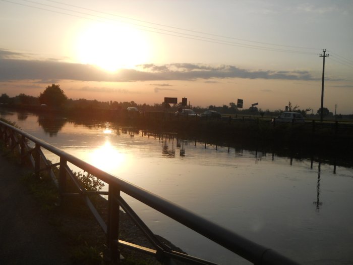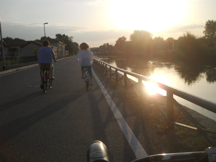 Passo oltre sui rettilinei della pianura. Affamato continuo fino a Vaprio d'Adda dove scendo sul fiume, lo attraverso e mi scofano una tonnellata di pizza. Sono le 11:00 quando riparto con calma e ben rifocillato!