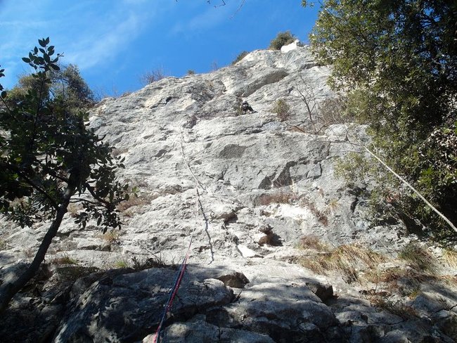 Esco dalle rocce e vado a sinistra su una chiara traccia di sentiero e rinvio ad un alberello per tener la corda lontana dai sassi ed evitare di lanciarne. Qualcosa si muoverà comunque mi dirà il Toso.
