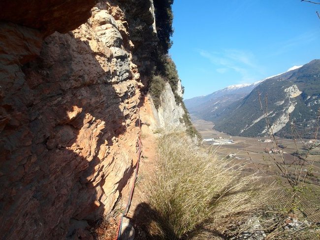 Vabbè! Finisco il tiro divertito e traverso a destra in sosta, l'unica un po' esposta che dà la sensazione di potersi tuffare nel fiume Sarca con un piccolo saltino!