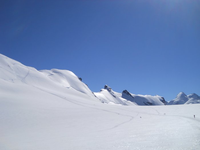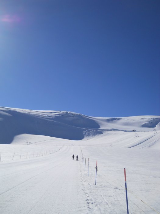 Qualche crepaccio in effetti c'è ma ho visto dalla funivia che si passa tranquillamente e c'è ancora la traccia del gatto delle nevi...
