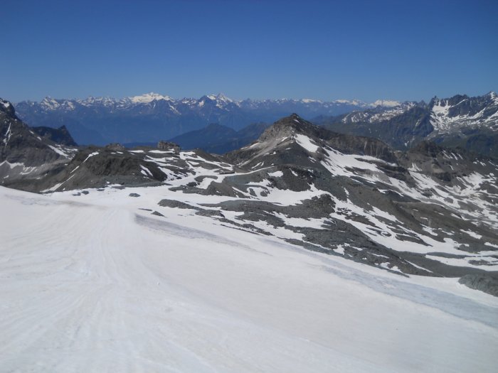 Oggi la visibilità è totale. Il Monviso, il Gran Paradiso si vedono nitidi. Il Monte Bianco sembra più vicino, il Cervino invece è diventato più piccolo...Qua dietro poi dalla parte svizzera e del confine svizzero/italiano è tutto un sogno...