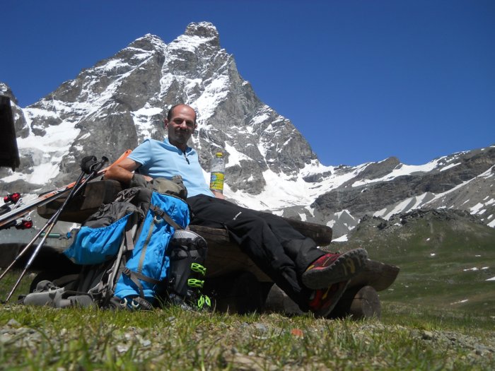 Sulla panchina nel praticello di Plan Maison sotto al Cervino, mi sento radioso e soddisfatto per il mio primo 4000 con gli sci e la visione di un altro nuovo mondo da esplorare!