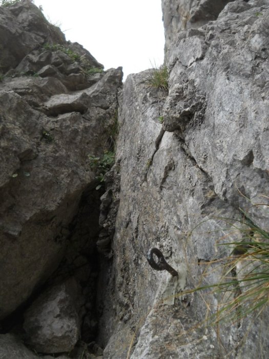 Supero la vecchia sosta di calata del soccorso e mi incanalo su a destra, poi a sinistra su roccette sempre più dritte ma ben gradinate e ammanigliate.
