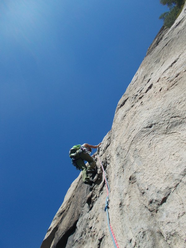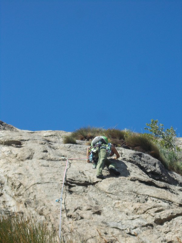 Per non dover fare per la terza volta il passo chiave del primo tiro a rischio volo, mi sono anche costruito un rinvio rigido, lungo 50cm per affrontare il passaggio ben protetto. L'aggeggio si chiama Jack, in riferimento alle canzoni degli AC/DC e lo utilizzerò altre due volte durante la scalata per affrontare un paio di passi in tranquillità.