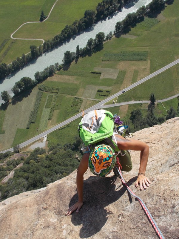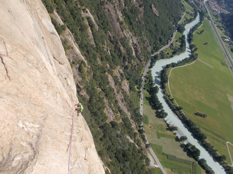 Da qui in poi il tiro è molto continuo e molto bello da scalare e il diedrino a tacche (uno dei passi chiave della via) è anche impegnativo. Molti dicono che sia il tiro chiave ma la scalata è fortunatamente sempre soggettiva e mi impegnerà di più il tiro successivo, comunque il 5c è da scalare, le protezioni mi danno sicurezza ed è spettacolare poi uscire dal tiro da un facile strapiombino e trovarsi a sinistra del grande tetto proprio nel centro del paretone! Il più grande! Quello che si vede benissimo dalla strada! Vedi via n°2 su vielunghevalledaosta.