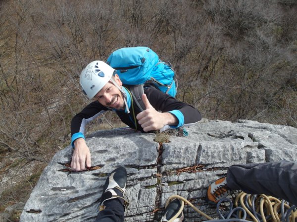 Siamo in partita ragazzi e ora su, Silvie e Fabri...che gentilmente in questo tiro e nell'ultimo porta il mio macigno di zaino per lasciarmi scalare leggero! Giustamente mi maledirà per quanto sia pesante e scomodo per scalare! Un altro breve trasferimento su sentiero (andare a mezza costa a destra!!) e poi attacca il dito vero e proprio con uno spettacolare tiro di 5a dalla linea e dalla roccia magnifica...