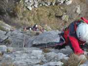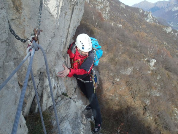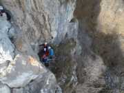 Integro con un cordino in uno spuntone perchè vedo uno spit con la roccia fessurata alla base e la protezione successiva è un po' lontana ...capita!
