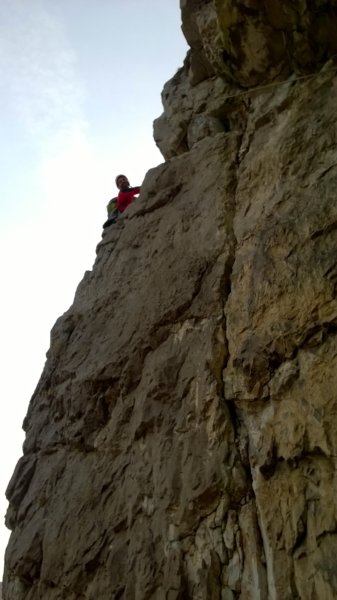 Quando arrivo, il Toso ha già integrato le protezioni in sosta (fatta da un unico spit) con un nut e un friend contrapposti e ha anche già ingaggiato il diedro. Nel frattempo arrivano Silvie e Fibra...