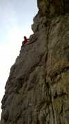 Risalito da un canale un breve zoccolo in diagonale a destra, ci si porta alla base di un bellissimo diedro, ahimè molto liscio e unto.