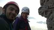 Per Silvie sono le prime vie di questo tipo e starà da seconda (ancora per poco) ma siam certi che si mangerà le difficoltà, per me è la prima via sulla Dolomia vera, Fibra si mette a disposizione in caso di difficoltà ma se ne starà da secondo godendosi comunque tanto la scalata fino in cima quindi io, come mi accenna il Toso, sarò "nelle insolite vesti di capocordata"!!!