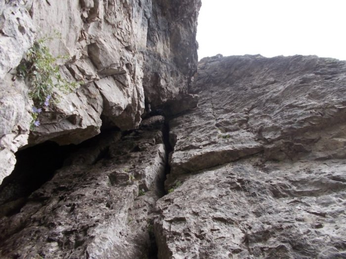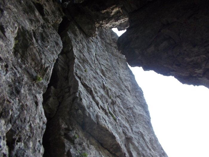 Parto con tranquillità e salgo in una calda e umida mezz'oretta fino alla base del camino del primo tiro percorso da Dones nel 1912...Porcacci che pelo!