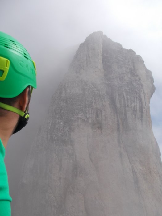 In un'altra ora scarsa siamo in cima al Cinquantenario dove sostiamo una cinquantina di minuti a far pranzo mentre aspettiamo che le nuvole si diradino e ci facciano veder qualcosa...e la parete gialla della Cecilia compare immensa dopo aver giocato un po' a nascondino...