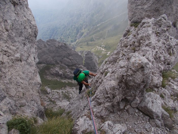 Scendiamo e sono talmente stranito della tranquillità con cui ho affrontato il Cinquantenario. Continuo a pensarci e dimentico di allungare le protezioni sulla crestina che porta alla Cecilia ed è un bagno di sangue tirarsi dietro la corda...soprattutto dopo la spaccatura.