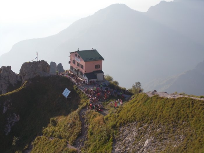 Il Campaniletto del Rifugio è proprio qui. Ci informiamo sugli orari di concerto e cena e ci stiamo già imbragando per affrontare la via con la colonna sonora di quattro brave musiciste classiche e moderne...