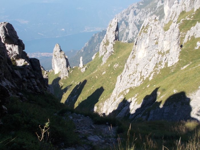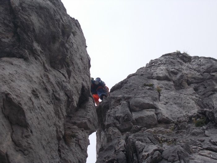 Sulla "placca" finale mi sembrava di essere in falesia (pur non sottovalutando i pericoli oggettivi della Grigna) e, mentre salivo, pensavo alla relazione del Toso della nostra prima salita alla Cecilia (che se leggerete, almeno la parte blu, farà tanto piacere sia a me che a lui ...ma leggete anche il resto va!!!) in cui dice "Ricordo l'ultimo tiro, che mi era sembrato così esposto, anche se ben ammanigliato... Non l'ho più ritrovato, quel tiro...".