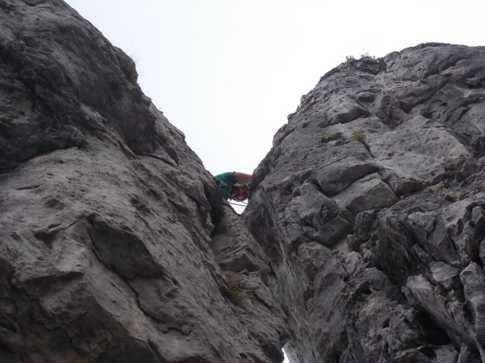 In realtà la cosa è andata anche peggio: parto e penso:"Quando arrivo al primo resinato allungo la protezione" e, dopo essermi alzato chiacchierando fino al chiodo, dimentico di farlo... aggiungo una protezione in clessidra e penso:"Alla discesa allungo la protezione", arrivo alla discesa e mi dimentico di allungare...un cretino!!!