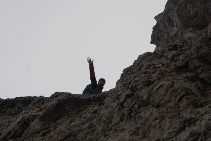 Per il terzo tiro è Laura a mandarmi da primo. Un problemino alle mani le sta rovinando un po' il pomeriggio e cerco di accomodare le cose come posso: scalo e sto un po' più attento a lei di quanto ci starei normalmente fino a sembrarle anche pesante ma cercando di non superare il limite.