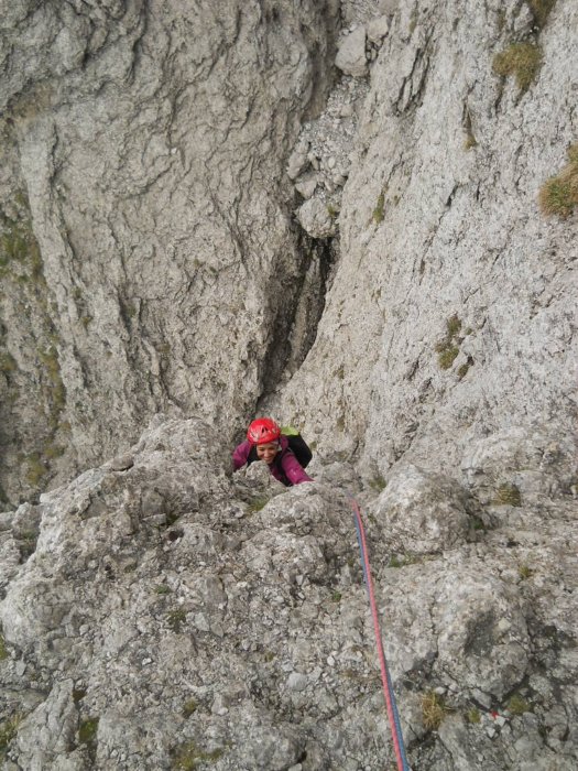 Supero il canale e, con un passo un po' tecnico (seppur dato di III ma è tutto relativo), mi immetto nella parete della Cecilia sulla rampetta inclinata verso destra e concateno il terzo e quarto tiro della via che conosco e so che sono abbastanza dritti da poterlo fare.