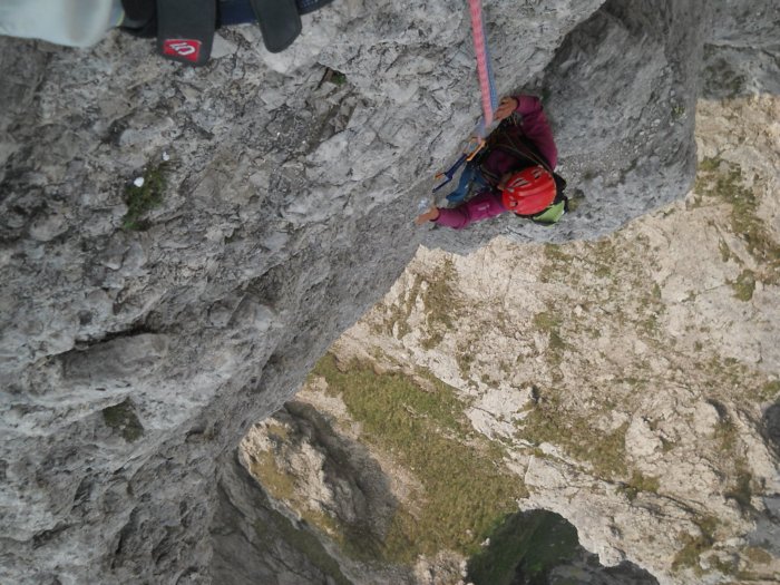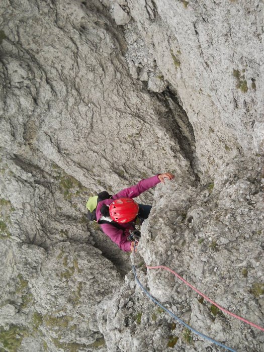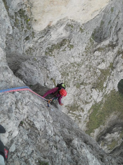 Parto abbassandomi leggermente sulla destra in vista di un resinato piazzato saggiamente per proteggere il secondo e l'eventuale rientro, proseguo sulla facile cengia irregolare, aggiungo un cordino a cui rinvio, poco dopo sono in sosta e la mia socia mi raggiunge velocissima.