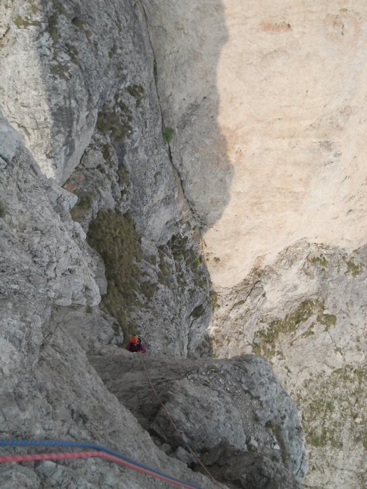 Il primo cortissimo, abbastanza dritto e carino ma con 40 - 45 metri di corde da recuperare e il secondo un po' camminato fino alla sosta prima del canale da cui si attacca finalmente la Cecilia.