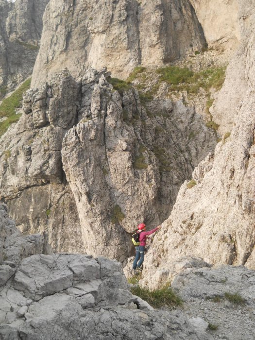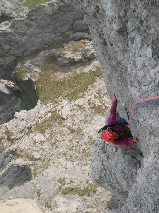 Laura affronta i primi metri molto esposti dell'ultimo tiro al Cinquantenario