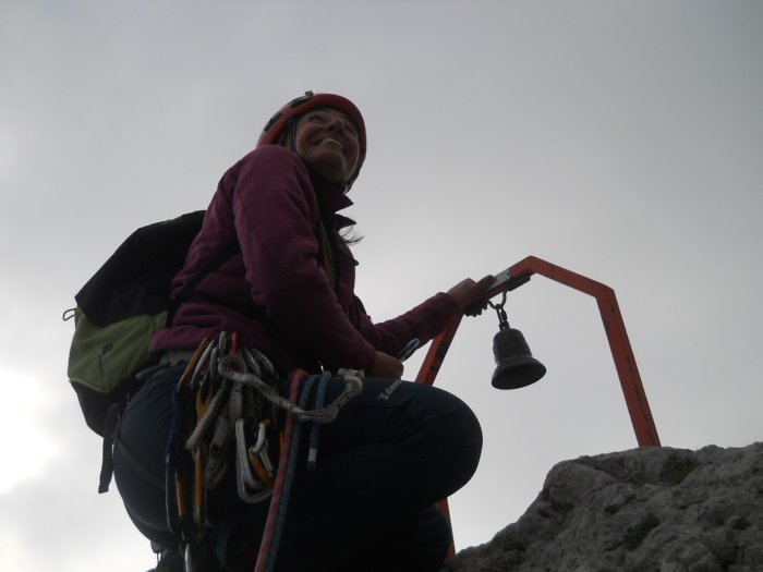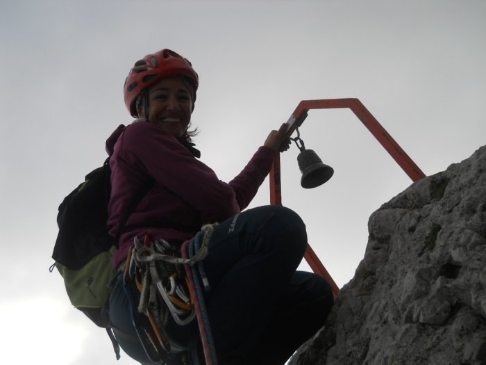 Tre metri di roccette facili e sono in vista della sosta, del vecchio anello di calata e della famosa campanella di vetta!