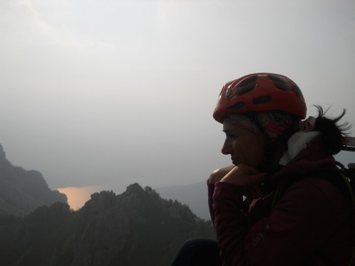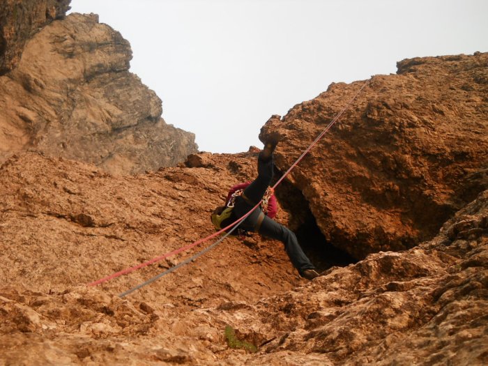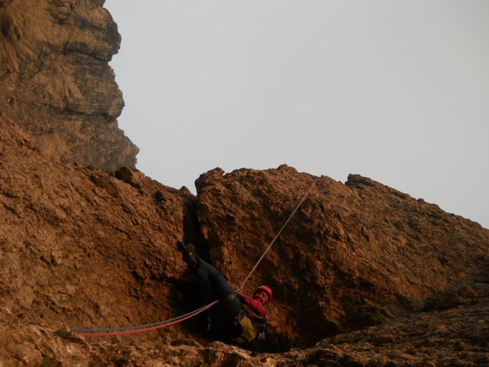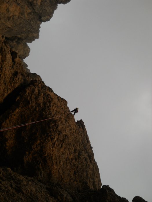 Ci godiamo combattuti tra strizza ed esaltazione la doppia intermedia di 40 metri che precipita nel vuoto mentre le rocce si accendono delle luci del tramonto, poi di nuovo un facile traverso in leggera salita seguendo dei vecchi bolli rosso scuri per tornare alla prima sosta e calarsi di pochi metri fino alla base.