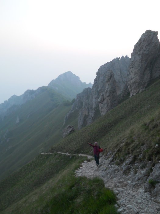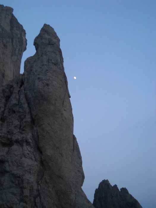 Cenetta veloce con quel che abbiamo, due mezzi panini, un sorso d'acqua frizzante, avanzi di wafers, frutta secca e giù nel crepuscolo, chiacchierando di priorità, di ciò che resta e di mille altre cose o spesso in silenzio tra guglie, prati, camosci fino al buio della faggeta dove la Luna, già luminosa e alta nel cielo, non riesce nemmeno a far cenno della sua presenza.
