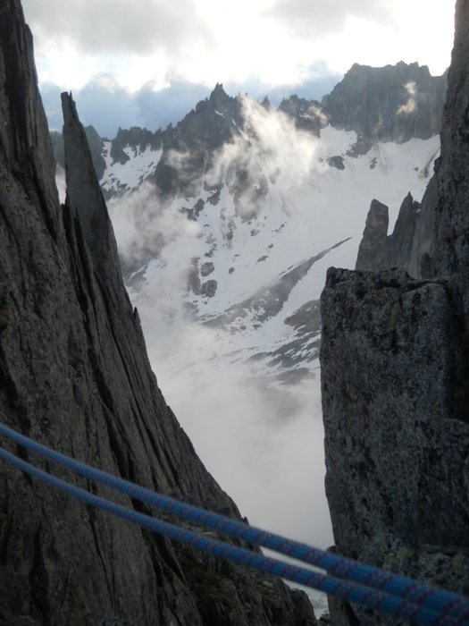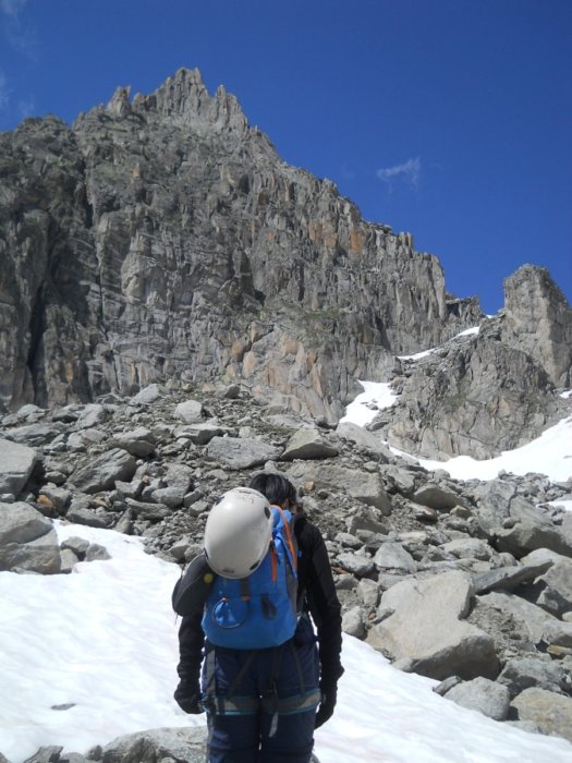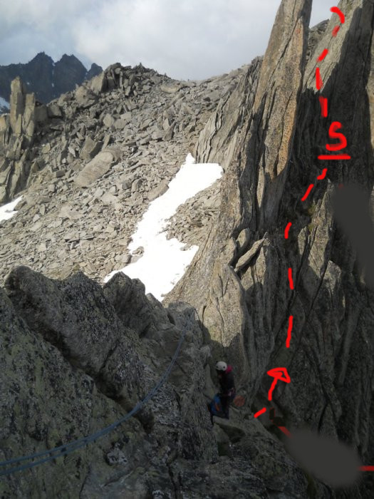Saliamo "tranquilli" nel primo pomeriggio verso la Sidelenhütte e poi per nevai all'attacco che si trova presso un intaglio con due gradini evidenti, a sinistra di un grosso gendarme che non scaleremo - 1 chiodo e uno spit evidenti).