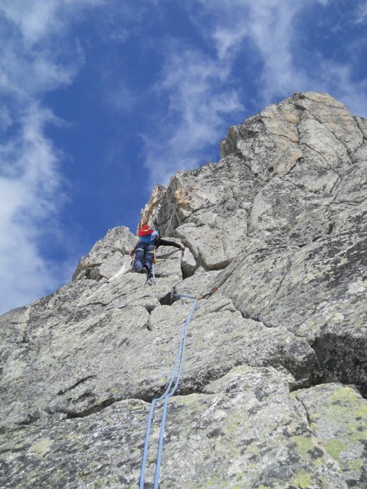 Riparte lei da prima per il secondo e il terzo tiro III, IV, salendo e seguendo dapprima gli spit e i chiodi sul fianco sinistro della cresta (N) ancora larga fino in sosta e poi, salendo in cima a un 'apparentemente (da sotto) tozzo rilievo, sempre seguendo gli spit che questa volta salgono alla sua destra.
