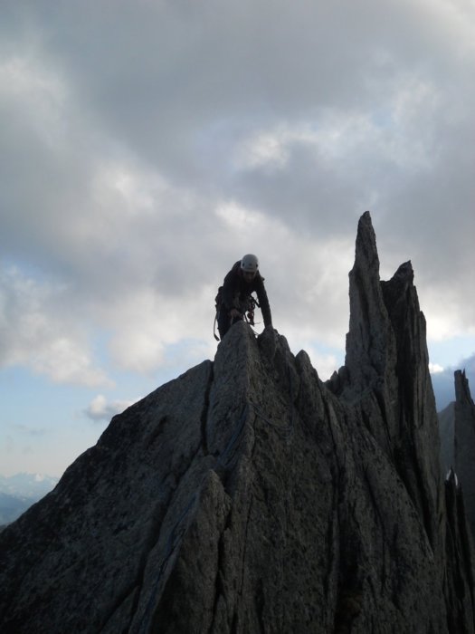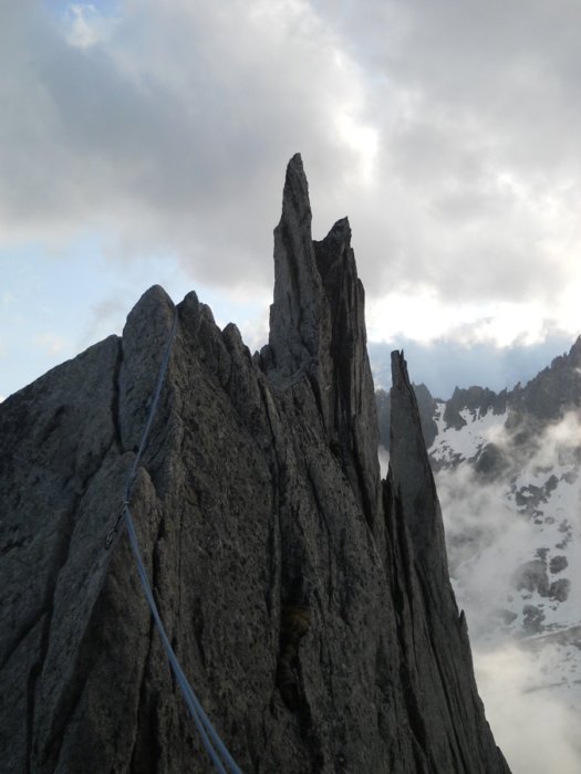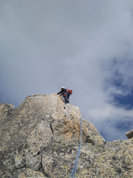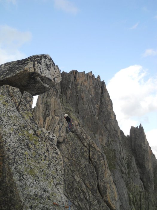 Faccio su e giù per qualche metro e vedo di nuovo l'affilatissimo spuntone col cordone intorno ma questa volta è in via, ne punto l'apice salendo a destra per una logica successione di tacche per mani e piedi, rinvio nel cordone dopo averlo almeno un po' testato tirandolo molto forte, mi abbasso su un altro spuntone/lama a sinistra e con un piccolo passo atletico probabilmente di IV, esco dalla cresta.