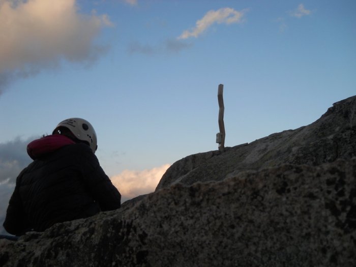 Su uno spuntone e un friend recupero Laura che sale agevolmente interpretando il passaggio finale in modo diverso e ci separa dalla cima solo una facile camminata e un piccolo zig zag per facili placche e cengie che aprirà Laura