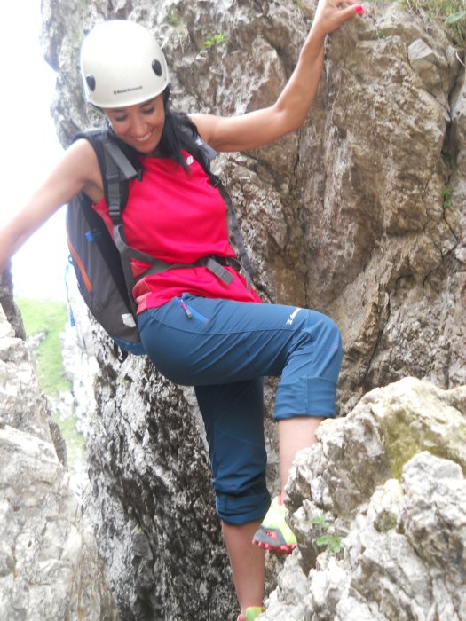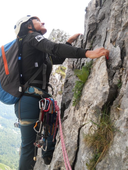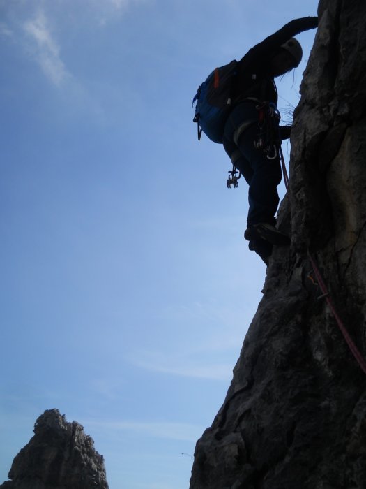 Una volta rassicurata che la spaccata (che ho visto fare) dall'avancorpo alla cima vera e propria non è così ampia per il suo fisico minuto, parte e si staglia immediatamente nel cielo.