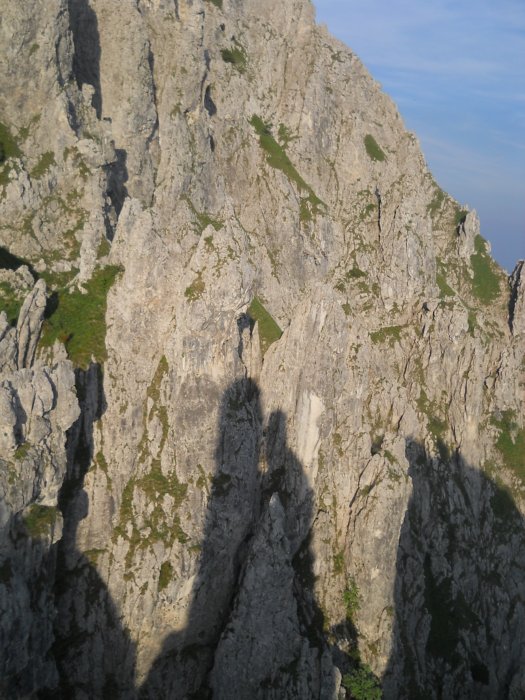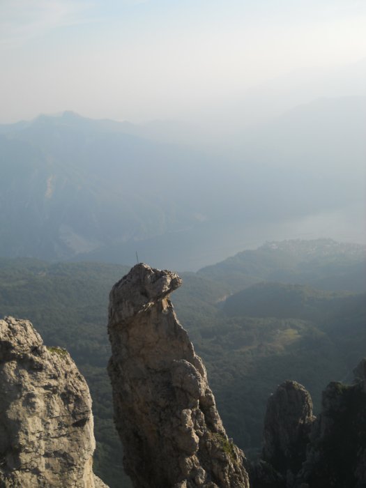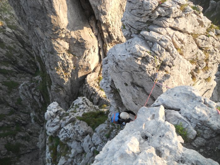 Sono qui con un piede di qua e uno di là solo perchè, proprio vicino all'ultimo appoggio per i piedi dell'anticima, c'è uno spuntone attorno al quale un cordino del 7 si avvolge fisso e sicuro...
