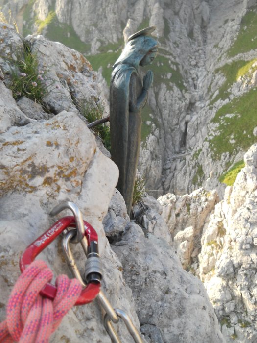 Mi sporgo dalla cima sull'altro versante e, mezzo metro sotto di me, vedo i due bei fittoni con catena e anello di calata pronti ad accogliermi a fianco della madonnina di vetta!
