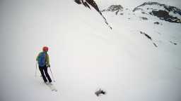 Poi un lungo traverso per cambiare lato del Vallone e in una salitella io, con gli sci in mano, applico tecniche di sopravvivenza alpinistiche imparate sul Morterathsch mentre Laura procede scalettando spedita.