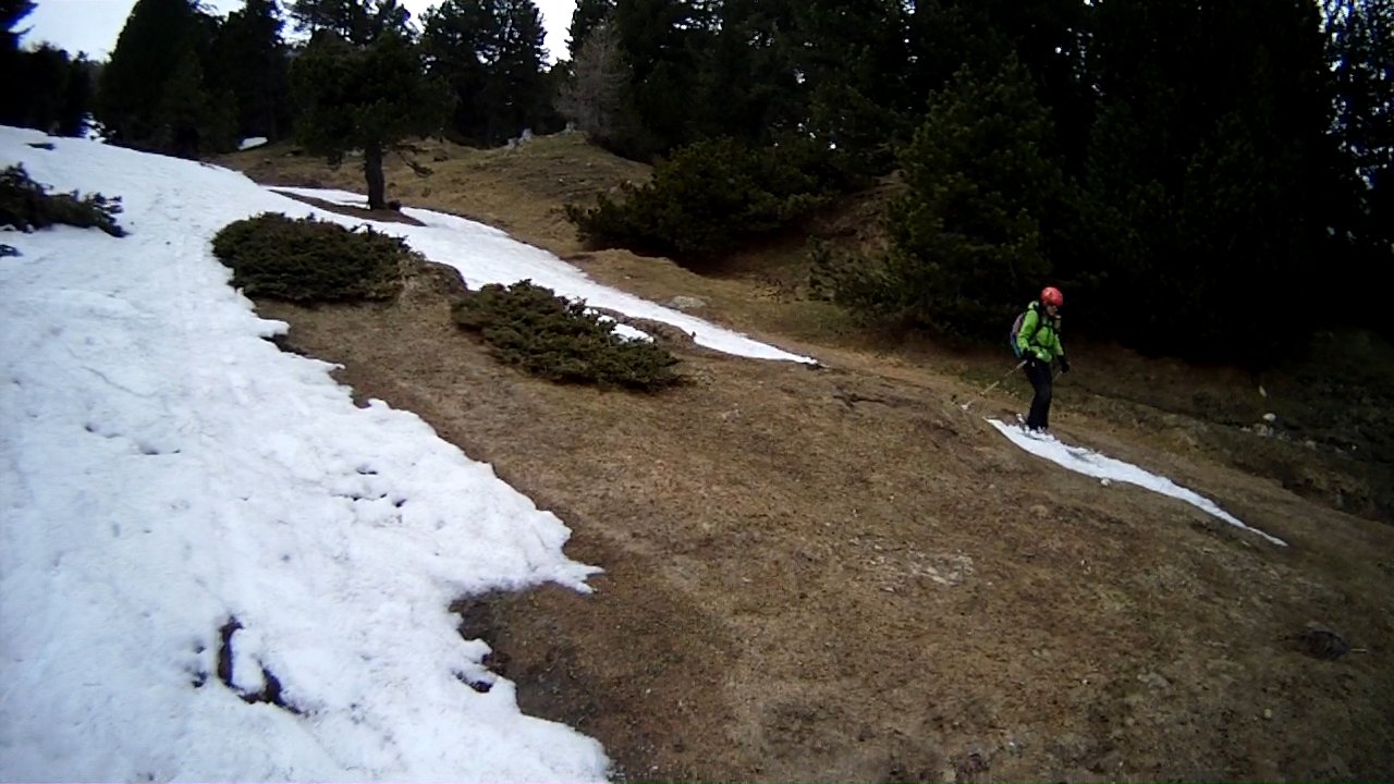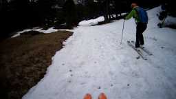 Sfruttiamo entrambi la neve fino all'ultimo centimetro disponibile e poco dopo siamo a piedi nel prato.