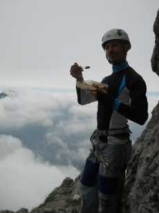 Attraversiamo gli ultimi canali, lasciamo sulla destra la base della parete e saliamo slegati per facili roccette fino al terrazzino in corrispondenza del primo resinato della via ("la Rampa"). Un Cassin piuttosto recente ma già di buona annata! Sono le 18:00.