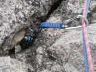 Parto usando lo sperone alle spalle della sosta come in un camino. Sto andando di là, sto per staccarmi quando:"Fermo lì!".