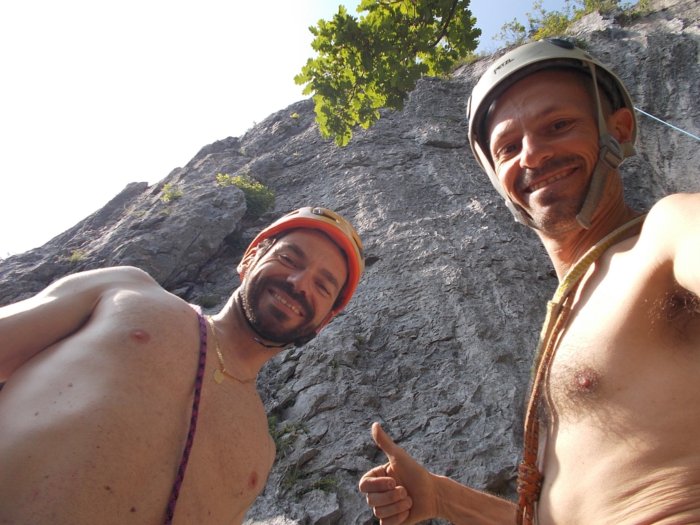 Scende un biellese. Sono in tre. Due sono in cima...che faccio? Ma sì. Sarà un bagno di sangue per quanto mi tirerà giù la corda ma concateno e vado in cima.