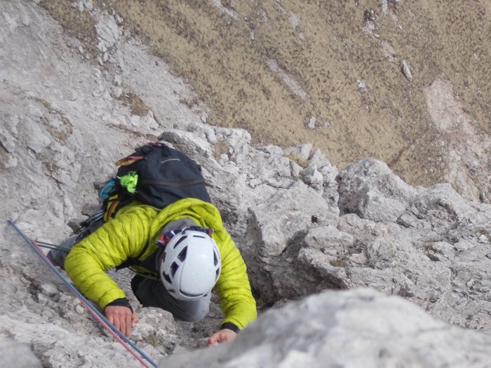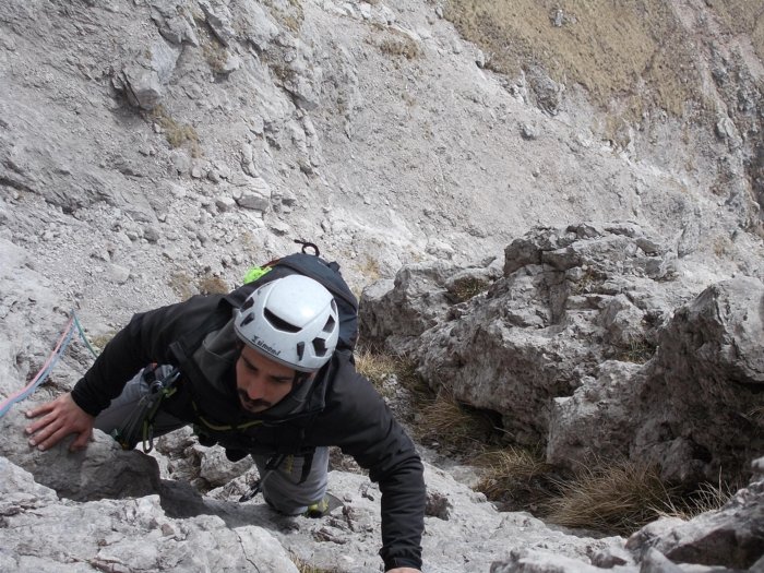 Esco sulla rampa/canale in esposizione scalando ancora bene ma duro e un po' in strapiombo. Oggi non riesco ad usare in modo efficace l'altra parte del gelido camino e le mani ora sono finite...