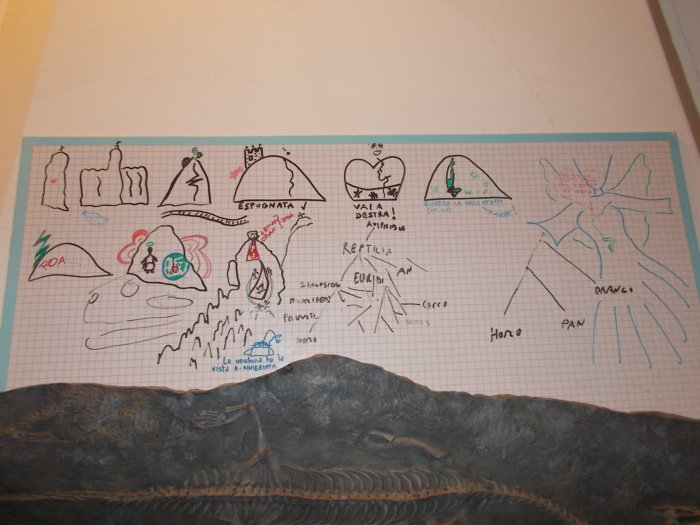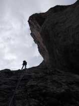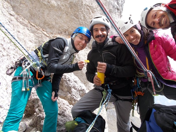 Tutti siamo stregati dai cordini che uniscono i vecchi chiodi alla nostra destra sulla "Via dei Ragni" liberata da Matteo Piccardi nel 2011...chissà che qualcuna o qualcuno dei ragazzi non diventi forte almeno come lui...e chissà che un giorno io non impazzisca e mi metta lì in mezzo con staffe e cose varie per salirla in artificiale...sarebbe epico!