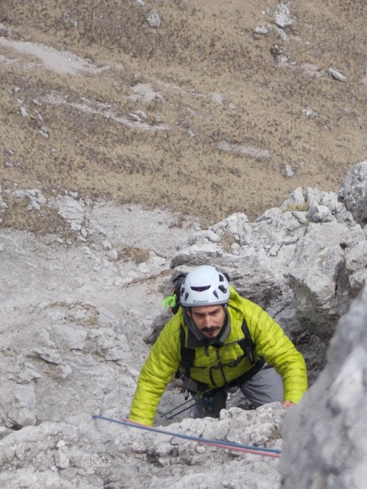 Ci prepriamo, la cordata davanti a noi sparisce e procediamo a due primi che saliranno prima uno e poi l'altro e due secondi che Invece saliranno insieme, leggermente sfalsati come fossero i secondi di una cordata a tre.