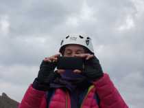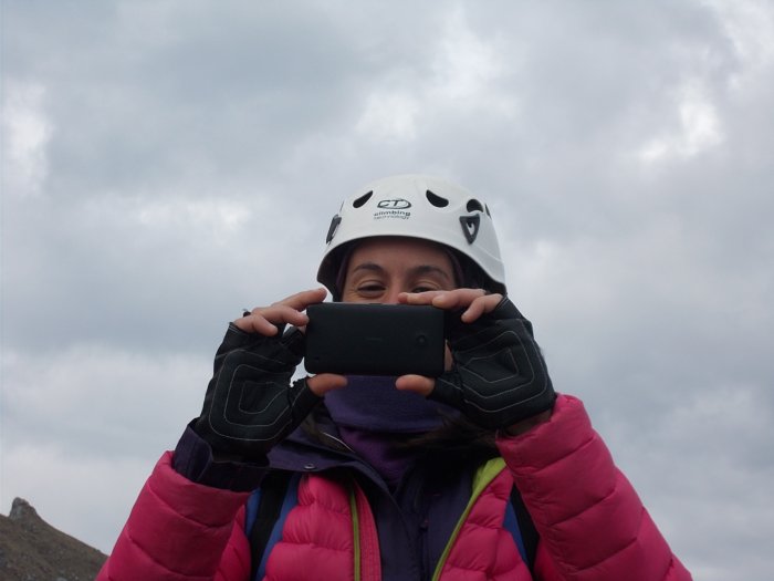 Allungo diversi metri, forse anche otto metri il mio barcaiolo in sosta, mi siedo verso il camino dove vedo la sosta in cui stanno gli Inv e mi godo lo spettacolo della cordata biellese che affronta il traversino, di Simo che parte per affrontare il gelido camino e lo passerà molto meglio di me così come tutte le Inv ...Vedo dall'alto Fede che, concentratissima, assicura Simo e vedo quello sprizzo di colore di Silvie che tempesta di scatti tutto intorno...