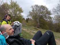 Poi cantiamo a due voci in discesa, ci tempestiamo di scatti, Simo ci sfotte un po', facciamo corse pazze, qualche minuto sdraiati tutti e quattro su un bel prato e poi...e poi giù...poi pioverà...mi chiama il Toso per sentire come è andata e gli descrivo solo il freddo e la durezza del camino oggi e l'espressione estasiata dei ragazzi dopo essere passati di là...poi un bel piatto di fusilli al sugo chimico, formaggio, due fettine di salame, il tutto accompagnato da un ottimo Tocai friulano e belbuon Ramandolo per cui ancora ringrazio il mio amico Toso!