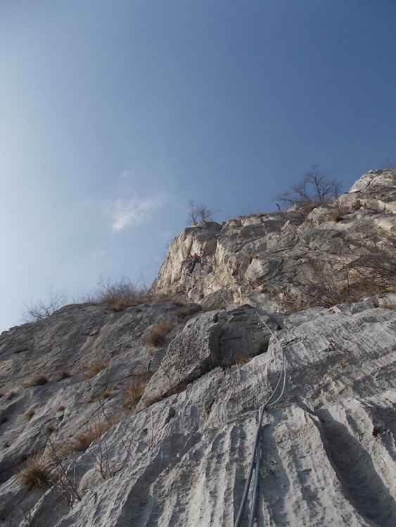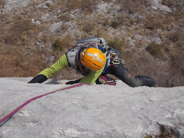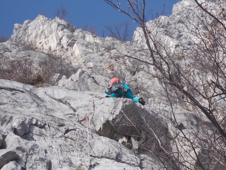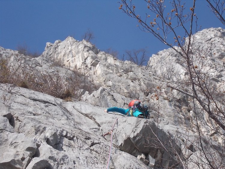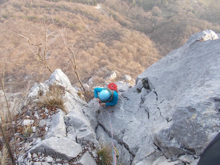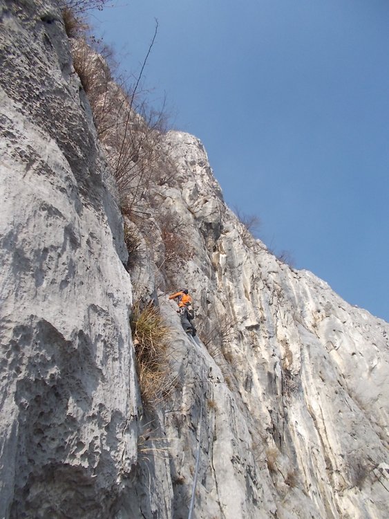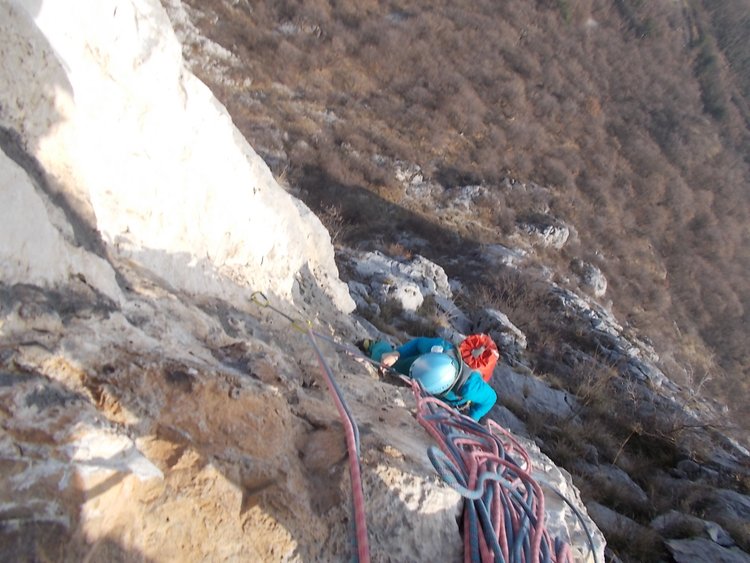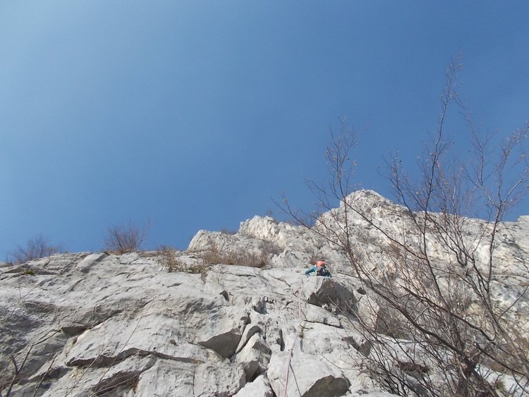 Una netta fessura sulla destra, poi a sinistra e poi su nel canale diedro finale, verticale, sempre ben chiodato ma non ulteriormente integrabile di un bel 5c, 6a, fastidiosamente unto, continuo e con l'uscita lunga in cui, a corto di braccia e intenzionato a risparmiare, spengo per un attimo il cervello, mi rilasso e, uso il Fabri come ultimo appiglio uscendo in sosta stanchino ma motivato.