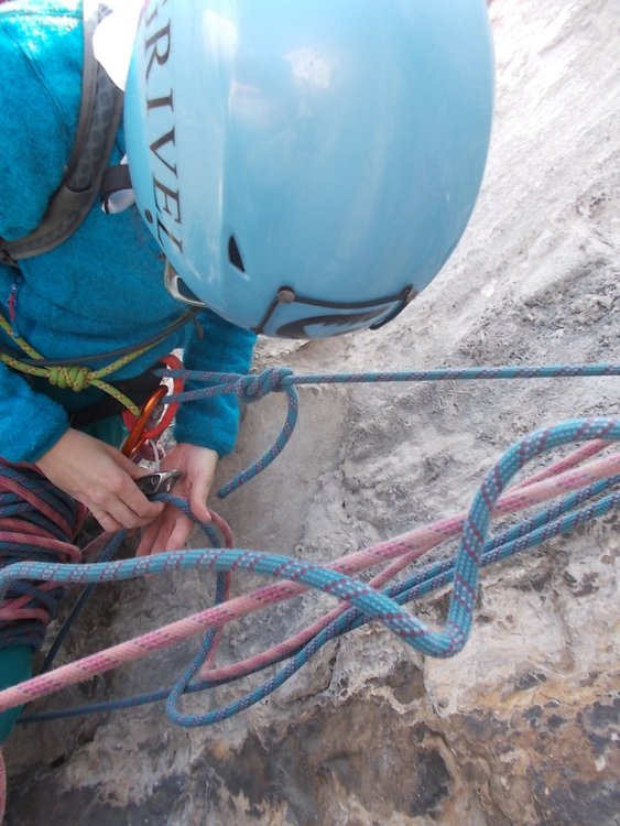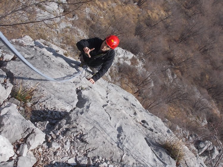 Mi accaparro il diritto ma soprattutto il dovere di uscire dalla via in frettissima!! Voglio che restiamo attaccati il meno possibile a quel sasso e non è momento di fare esperienza di uscite dalle vie.