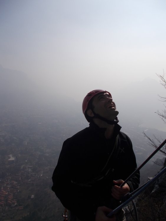 Fabri che, pur potendo salire, mi ha aspettato almeno una decina di minuti in sosta, riparte sorridente per l'ultimo tiro della via. Se la sta godendo e mi lascia una fettuccia fuori dallo spigolo iniziale di 6a+ dove poter azzerare o rinviare. Grazie Fibra! Ci si vede in cima...spero!!!