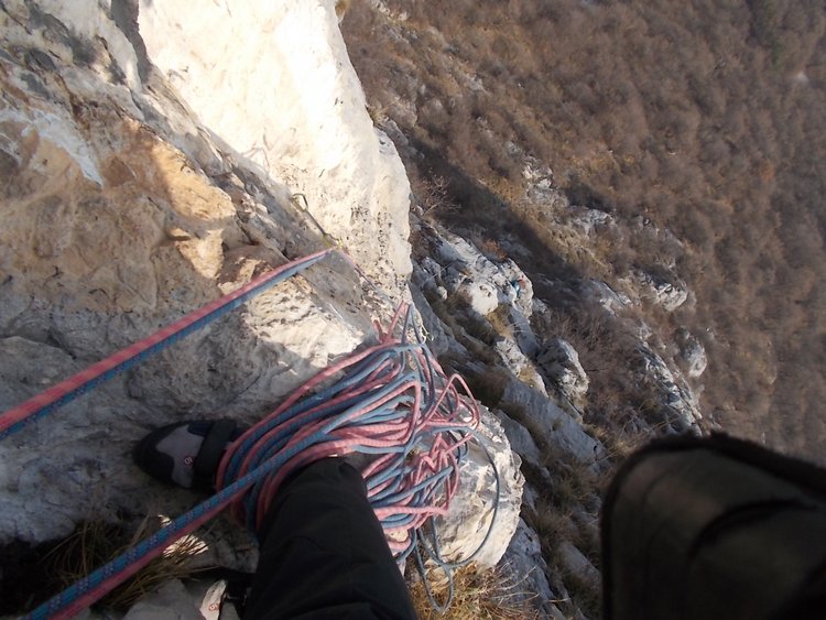 ...non dopo aver fatto cadere un sasso...mannaggia a me...ma non so come. Forse coi piedi, con la corda, le ginocchia, non so. So solo che credo di essere stato io. Il sasso sbatte sul sentiero alla base del Medale...fortunatamente vuota, dopo che ho urlato come un pazzo "Sassooooo" per quattro volte, mentre il sasso picchiava poco sotto di me, non su Criss e Cross fortunatamente (le mie mezze corde che ha voluto la Fe...per fargli finire la via lasciata incompiuta qualche settimana fa...), arrivando poi a terra in mille pezzi ad una velocita da Enterprise...